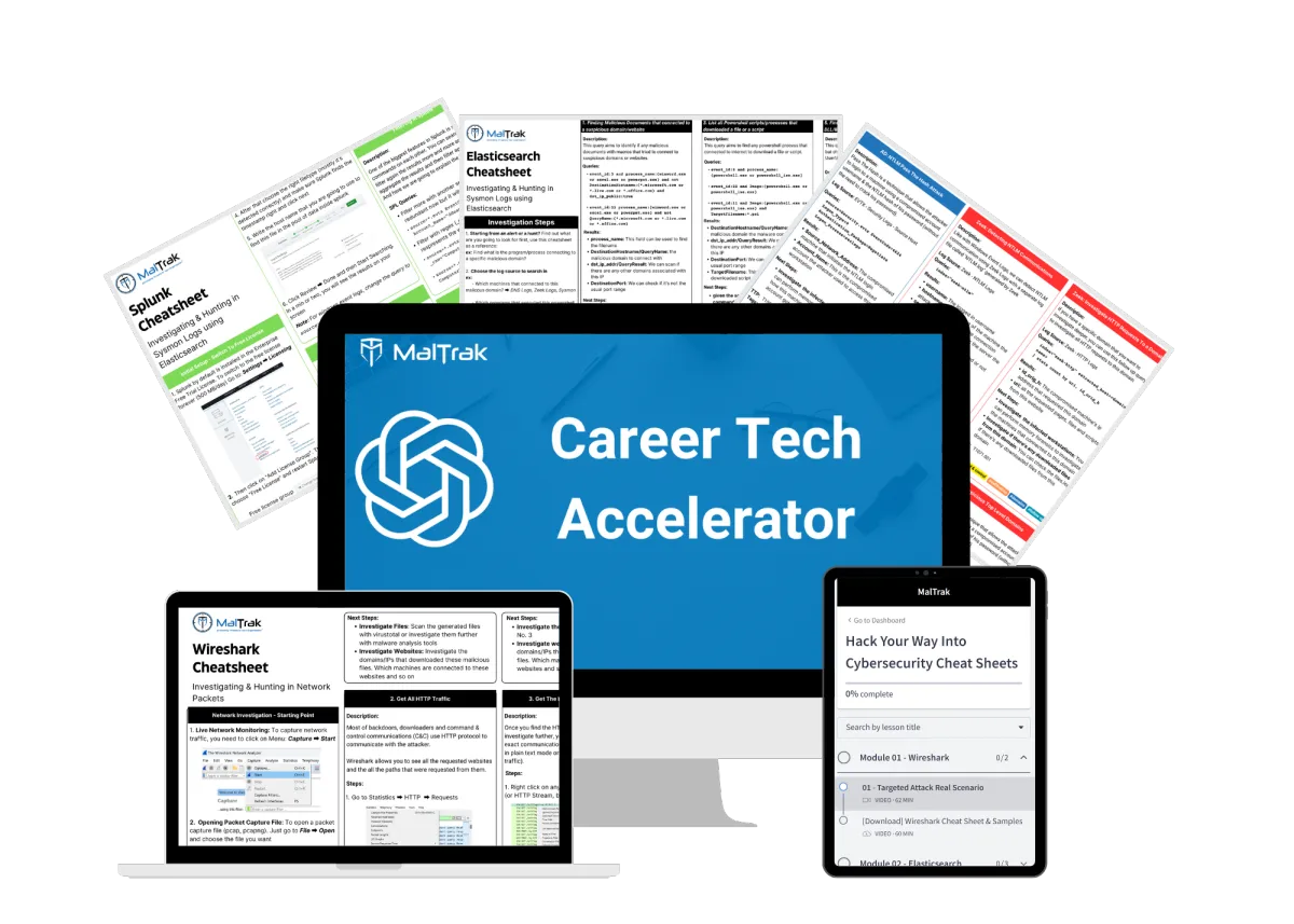 These are 3 expert-crafted copy-paste cheatsheets accompanied by a hands-on training to help you impersonate an expert in the field, analyze real cybersecurity attacks, showcase your skills on a blog and get recruiters and hiring managers reach you out to work with them.